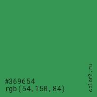 Цвет #369654 в цветовой модели RGB обозначается тремя октетами (54, 150, 84) в десятичном формате и #369654 в шестнадцатиричном (hex) формате, которые являются интенсивностью красного 54 (hex 36), интенсивность зелёного 150 (hex 96) и интенсивность синего 84 (hex 54).
