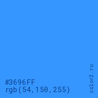 Цвет #3696FF в цветовой модели RGB обозначается тремя октетами (54, 150, 255) в десятичном формате и #3696FF в шестнадцатиричном (hex) формате, которые являются интенсивностью красного 54 (hex 36), интенсивность зелёного 150 (hex 96) и интенсивность синего 255 (hex FF).
