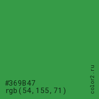 Цвет #369B47 в цветовой модели RGB обозначается тремя октетами (54, 155, 71) в десятичном формате и #369B47 в шестнадцатиричном (hex) формате, которые являются интенсивностью красного 54 (hex 36), интенсивность зелёного 155 (hex 9B) и интенсивность синего 71 (hex 47).