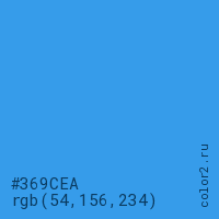 Цвет #369CEA в цветовой модели RGB обозначается тремя октетами (54, 156, 234) в десятичном формате и #369CEA в шестнадцатиричном (hex) формате, которые являются интенсивностью красного 54 (hex 36), интенсивность зелёного 156 (hex 9C) и интенсивность синего 234 (hex EA).