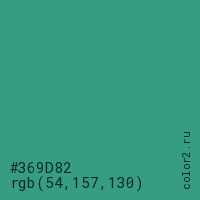 Цвет #369D82 в цветовой модели RGB обозначается тремя октетами (54, 157, 130) в десятичном формате и #369D82 в шестнадцатиричном (hex) формате, которые являются интенсивностью красного 54 (hex 36), интенсивность зелёного 157 (hex 9D) и интенсивность синего 130 (hex 82).