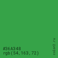 Цвет #36A348 в цветовой модели RGB обозначается тремя октетами (54, 163, 72) в десятичном формате и #36A348 в шестнадцатиричном (hex) формате, которые являются интенсивностью красного 54 (hex 36), интенсивность зелёного 163 (hex A3) и интенсивность синего 72 (hex 48).