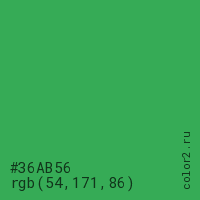 Цвет #36AB56 в цветовой модели RGB обозначается тремя октетами (54, 171, 86) в десятичном формате и #36AB56 в шестнадцатиричном (hex) формате, которые являются интенсивностью красного 54 (hex 36), интенсивность зелёного 171 (hex AB) и интенсивность синего 86 (hex 56).