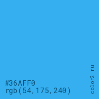 Цвет #36AFF0 в цветовой модели RGB обозначается тремя октетами (54, 175, 240) в десятичном формате и #36AFF0 в шестнадцатиричном (hex) формате, которые являются интенсивностью красного 54 (hex 36), интенсивность зелёного 175 (hex AF) и интенсивность синего 240 (hex F0).