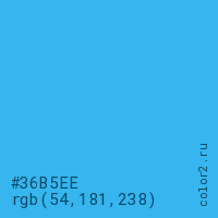 Цвет #36B5EE в цветовой модели RGB обозначается тремя октетами (54, 181, 238) в десятичном формате и #36B5EE в шестнадцатиричном (hex) формате, которые являются интенсивностью красного 54 (hex 36), интенсивность зелёного 181 (hex B5) и интенсивность синего 238 (hex EE).