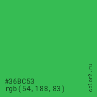 Цвет #36BC53 в цветовой модели RGB обозначается тремя октетами (54, 188, 83) в десятичном формате и #36BC53 в шестнадцатиричном (hex) формате, которые являются интенсивностью красного 54 (hex 36), интенсивность зелёного 188 (hex BC) и интенсивность синего 83 (hex 53).