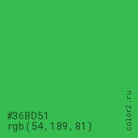 Цвет #36BD51 в цветовой модели RGB обозначается тремя октетами (54, 189, 81) в десятичном формате и #36BD51 в шестнадцатиричном (hex) формате, которые являются интенсивностью красного 54 (hex 36), интенсивность зелёного 189 (hex BD) и интенсивность синего 81 (hex 51).