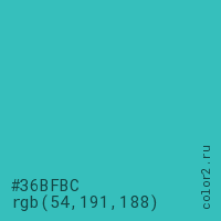 Цвет #36BFBC в цветовой модели RGB обозначается тремя октетами (54, 191, 188) в десятичном формате и #36BFBC в шестнадцатиричном (hex) формате, которые являются интенсивностью красного 54 (hex 36), интенсивность зелёного 191 (hex BF) и интенсивность синего 188 (hex BC).