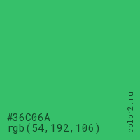 Цвет #36C06A в цветовой модели RGB обозначается тремя октетами (54, 192, 106) в десятичном формате и #36C06A в шестнадцатиричном (hex) формате, которые являются интенсивностью красного 54 (hex 36), интенсивность зелёного 192 (hex C0) и интенсивность синего 106 (hex 6A).