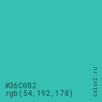 Цвет #36C0B2 в цветовой модели RGB обозначается тремя октетами (54, 192, 178) в десятичном формате и #36C0B2 в шестнадцатиричном (hex) формате, которые являются интенсивностью красного 54 (hex 36), интенсивность зелёного 192 (hex C0) и интенсивность синего 178 (hex B2).