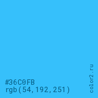 Цвет #36C0FB в цветовой модели RGB обозначается тремя октетами (54, 192, 251) в десятичном формате и #36C0FB в шестнадцатиричном (hex) формате, которые являются интенсивностью красного 54 (hex 36), интенсивность зелёного 192 (hex C0) и интенсивность синего 251 (hex FB).