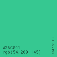 Цвет #36C891 в цветовой модели RGB обозначается тремя октетами (54, 200, 145) в десятичном формате и #36C891 в шестнадцатиричном (hex) формате, которые являются интенсивностью красного 54 (hex 36), интенсивность зелёного 200 (hex C8) и интенсивность синего 145 (hex 91).