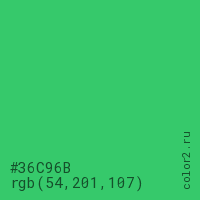 Цвет #36C96B в цветовой модели RGB обозначается тремя октетами (54, 201, 107) в десятичном формате и #36C96B в шестнадцатиричном (hex) формате, которые являются интенсивностью красного 54 (hex 36), интенсивность зелёного 201 (hex C9) и интенсивность синего 107 (hex 6B).
