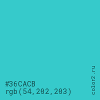 Цвет #36CACB в цветовой модели RGB обозначается тремя октетами (54, 202, 203) в десятичном формате и #36CACB в шестнадцатиричном (hex) формате, которые являются интенсивностью красного 54 (hex 36), интенсивность зелёного 202 (hex CA) и интенсивность синего 203 (hex CB).