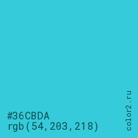 Цвет #36CBDA в цветовой модели RGB обозначается тремя октетами (54, 203, 218) в десятичном формате и #36CBDA в шестнадцатиричном (hex) формате, которые являются интенсивностью красного 54 (hex 36), интенсивность зелёного 203 (hex CB) и интенсивность синего 218 (hex DA).