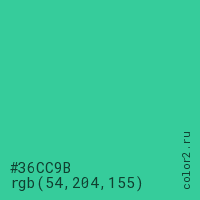 Цвет #36CC9B в цветовой модели RGB обозначается тремя октетами (54, 204, 155) в десятичном формате и #36CC9B в шестнадцатиричном (hex) формате, которые являются интенсивностью красного 54 (hex 36), интенсивность зелёного 204 (hex CC) и интенсивность синего 155 (hex 9B).