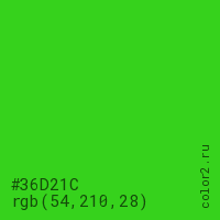Цвет #36D21C в цветовой модели RGB обозначается тремя октетами (54, 210, 28) в десятичном формате и #36D21C в шестнадцатиричном (hex) формате, которые являются интенсивностью красного 54 (hex 36), интенсивность зелёного 210 (hex D2) и интенсивность синего 28 (hex 1C).