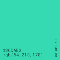 Цвет #36DAB2 в цветовой модели RGB обозначается тремя октетами (54, 218, 178) в десятичном формате и #36DAB2 в шестнадцатиричном (hex) формате, которые являются интенсивностью красного 54 (hex 36), интенсивность зелёного 218 (hex DA) и интенсивность синего 178 (hex B2).