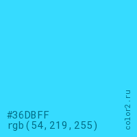 Цвет #36DBFF в цветовой модели RGB обозначается тремя октетами (54, 219, 255) в десятичном формате и #36DBFF в шестнадцатиричном (hex) формате, которые являются интенсивностью красного 54 (hex 36), интенсивность зелёного 219 (hex DB) и интенсивность синего 255 (hex FF).