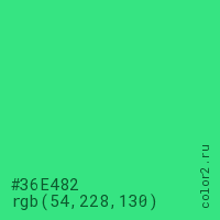 Цвет #36E482 в цветовой модели RGB обозначается тремя октетами (54, 228, 130) в десятичном формате и #36E482 в шестнадцатиричном (hex) формате, которые являются интенсивностью красного 54 (hex 36), интенсивность зелёного 228 (hex E4) и интенсивность синего 130 (hex 82).