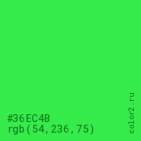 Цвет #36EC4B в цветовой модели RGB обозначается тремя октетами (54, 236, 75) в десятичном формате и #36EC4B в шестнадцатиричном (hex) формате, которые являются интенсивностью красного 54 (hex 36), интенсивность зелёного 236 (hex EC) и интенсивность синего 75 (hex 4B).