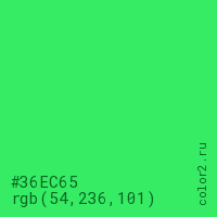 Цвет #36EC65 в цветовой модели RGB обозначается тремя октетами (54, 236, 101) в десятичном формате и #36EC65 в шестнадцатиричном (hex) формате, которые являются интенсивностью красного 54 (hex 36), интенсивность зелёного 236 (hex EC) и интенсивность синего 101 (hex 65).