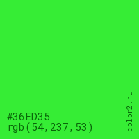 Цвет #36ED35 в цветовой модели RGB обозначается тремя октетами (54, 237, 53) в десятичном формате и #36ED35 в шестнадцатиричном (hex) формате, которые являются интенсивностью красного 54 (hex 36), интенсивность зелёного 237 (hex ED) и интенсивность синего 53 (hex 35).