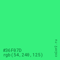 Цвет #36F07D в цветовой модели RGB обозначается тремя октетами (54, 240, 125) в десятичном формате и #36F07D в шестнадцатиричном (hex) формате, которые являются интенсивностью красного 54 (hex 36), интенсивность зелёного 240 (hex F0) и интенсивность синего 125 (hex 7D).