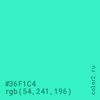 Цвет #36F1C4 в цветовой модели RGB обозначается тремя октетами (54, 241, 196) в десятичном формате и #36F1C4 в шестнадцатиричном (hex) формате, которые являются интенсивностью красного 54 (hex 36), интенсивность зелёного 241 (hex F1) и интенсивность синего 196 (hex C4).