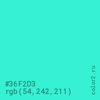Цвет #36F2D3 в цветовой модели RGB обозначается тремя октетами (54, 242, 211) в десятичном формате и #36F2D3 в шестнадцатиричном (hex) формате, которые являются интенсивностью красного 54 (hex 36), интенсивность зелёного 242 (hex F2) и интенсивность синего 211 (hex D3).