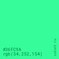 Цвет #36FC9A в цветовой модели RGB обозначается тремя октетами (54, 252, 154) в десятичном формате и #36FC9A в шестнадцатиричном (hex) формате, которые являются интенсивностью красного 54 (hex 36), интенсивность зелёного 252 (hex FC) и интенсивность синего 154 (hex 9A).