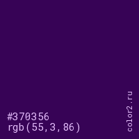 Цвет #370356 в цветовой модели RGB обозначается тремя октетами (55, 3, 86) в десятичном формате и #370356 в шестнадцатиричном (hex) формате, которые являются интенсивностью красного 55 (hex 37), интенсивность зелёного 3 (hex 03) и интенсивность синего 86 (hex 56).