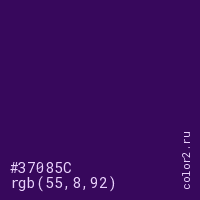 Цвет #37085C в цветовой модели RGB обозначается тремя октетами (55, 8, 92) в десятичном формате и #37085C в шестнадцатиричном (hex) формате, которые являются интенсивностью красного 55 (hex 37), интенсивность зелёного 8 (hex 08) и интенсивность синего 92 (hex 5C).