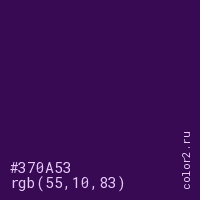 Цвет #370A53 в цветовой модели RGB обозначается тремя октетами (55, 10, 83) в десятичном формате и #370A53 в шестнадцатиричном (hex) формате, которые являются интенсивностью красного 55 (hex 37), интенсивность зелёного 10 (hex 0A) и интенсивность синего 83 (hex 53).