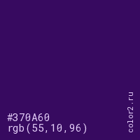 Цвет #370A60 в цветовой модели RGB обозначается тремя октетами (55, 10, 96) в десятичном формате и #370A60 в шестнадцатиричном (hex) формате, которые являются интенсивностью красного 55 (hex 37), интенсивность зелёного 10 (hex 0A) и интенсивность синего 96 (hex 60).