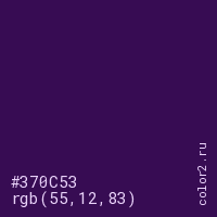 Цвет #370C53 в цветовой модели RGB обозначается тремя октетами (55, 12, 83) в десятичном формате и #370C53 в шестнадцатиричном (hex) формате, которые являются интенсивностью красного 55 (hex 37), интенсивность зелёного 12 (hex 0C) и интенсивность синего 83 (hex 53).