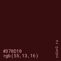 Цвет #370D10 в цветовой модели RGB обозначается тремя октетами (55, 13, 16) в десятичном формате и #370D10 в шестнадцатиричном (hex) формате, которые являются интенсивностью красного 55 (hex 37), интенсивность зелёного 13 (hex 0D) и интенсивность синего 16 (hex 10).