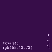 Цвет #370D49 в цветовой модели RGB обозначается тремя октетами (55, 13, 73) в десятичном формате и #370D49 в шестнадцатиричном (hex) формате, которые являются интенсивностью красного 55 (hex 37), интенсивность зелёного 13 (hex 0D) и интенсивность синего 73 (hex 49).