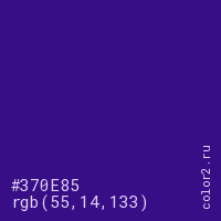 Цвет #370E85 в цветовой модели RGB обозначается тремя октетами (55, 14, 133) в десятичном формате и #370E85 в шестнадцатиричном (hex) формате, которые являются интенсивностью красного 55 (hex 37), интенсивность зелёного 14 (hex 0E) и интенсивность синего 133 (hex 85).
