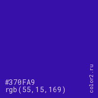 Цвет #370FA9 в цветовой модели RGB обозначается тремя октетами (55, 15, 169) в десятичном формате и #370FA9 в шестнадцатиричном (hex) формате, которые являются интенсивностью красного 55 (hex 37), интенсивность зелёного 15 (hex 0F) и интенсивность синего 169 (hex A9).