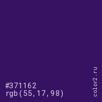 Цвет #371162 в цветовой модели RGB обозначается тремя октетами (55, 17, 98) в десятичном формате и #371162 в шестнадцатиричном (hex) формате, которые являются интенсивностью красного 55 (hex 37), интенсивность зелёного 17 (hex 11) и интенсивность синего 98 (hex 62).
