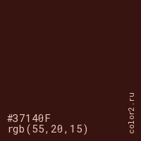 Цвет #37140F в цветовой модели RGB обозначается тремя октетами (55, 20, 15) в десятичном формате и #37140F в шестнадцатиричном (hex) формате, которые являются интенсивностью красного 55 (hex 37), интенсивность зелёного 20 (hex 14) и интенсивность синего 15 (hex 0F).