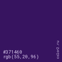 Цвет #371460 в цветовой модели RGB обозначается тремя октетами (55, 20, 96) в десятичном формате и #371460 в шестнадцатиричном (hex) формате, которые являются интенсивностью красного 55 (hex 37), интенсивность зелёного 20 (hex 14) и интенсивность синего 96 (hex 60).