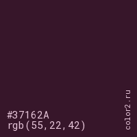 Цвет #37162A в цветовой модели RGB обозначается тремя октетами (55, 22, 42) в десятичном формате и #37162A в шестнадцатиричном (hex) формате, которые являются интенсивностью красного 55 (hex 37), интенсивность зелёного 22 (hex 16) и интенсивность синего 42 (hex 2A).