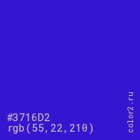 Цвет #3716D2 в цветовой модели RGB обозначается тремя октетами (55, 22, 210) в десятичном формате и #3716D2 в шестнадцатиричном (hex) формате, которые являются интенсивностью красного 55 (hex 37), интенсивность зелёного 22 (hex 16) и интенсивность синего 210 (hex D2).