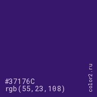Цвет #37176C в цветовой модели RGB обозначается тремя октетами (55, 23, 108) в десятичном формате и #37176C в шестнадцатиричном (hex) формате, которые являются интенсивностью красного 55 (hex 37), интенсивность зелёного 23 (hex 17) и интенсивность синего 108 (hex 6C).