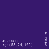 Цвет #37186D в цветовой модели RGB обозначается тремя октетами (55, 24, 109) в десятичном формате и #37186D в шестнадцатиричном (hex) формате, которые являются интенсивностью красного 55 (hex 37), интенсивность зелёного 24 (hex 18) и интенсивность синего 109 (hex 6D).