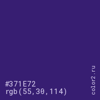 Цвет #371E72 в цветовой модели RGB обозначается тремя октетами (55, 30, 114) в десятичном формате и #371E72 в шестнадцатиричном (hex) формате, которые являются интенсивностью красного 55 (hex 37), интенсивность зелёного 30 (hex 1E) и интенсивность синего 114 (hex 72).