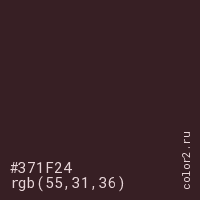 Цвет #371F24 в цветовой модели RGB обозначается тремя октетами (55, 31, 36) в десятичном формате и #371F24 в шестнадцатиричном (hex) формате, которые являются интенсивностью красного 55 (hex 37), интенсивность зелёного 31 (hex 1F) и интенсивность синего 36 (hex 24).