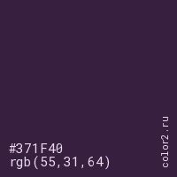 Цвет #371F40 в цветовой модели RGB обозначается тремя октетами (55, 31, 64) в десятичном формате и #371F40 в шестнадцатиричном (hex) формате, которые являются интенсивностью красного 55 (hex 37), интенсивность зелёного 31 (hex 1F) и интенсивность синего 64 (hex 40).